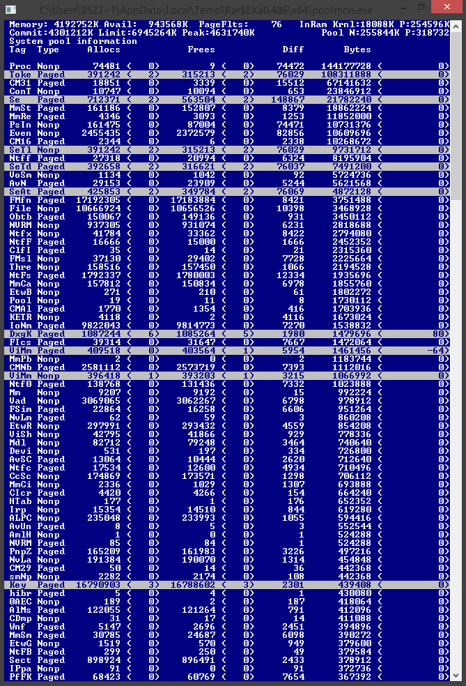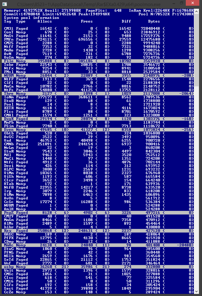 1. Запустите RAMMap и покажите скриншот вкладки Use Counts во время глюка. 2. Если утечка в Nonpaged Pool или Paged Pool - причина в каком-то из драйверов. Чтобы его определить: