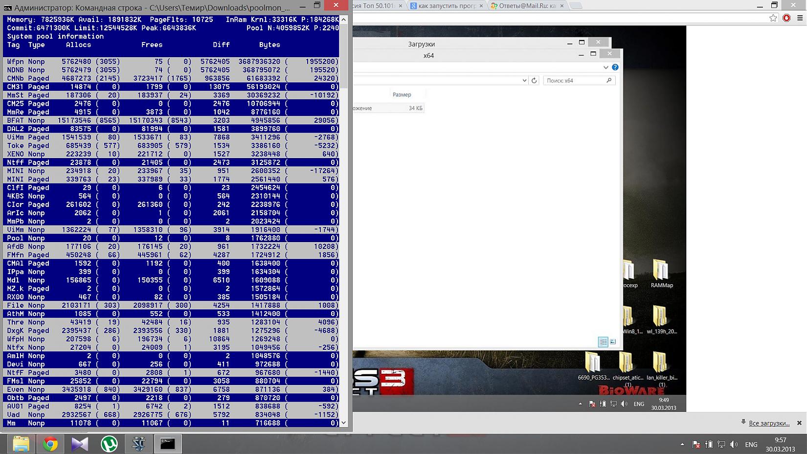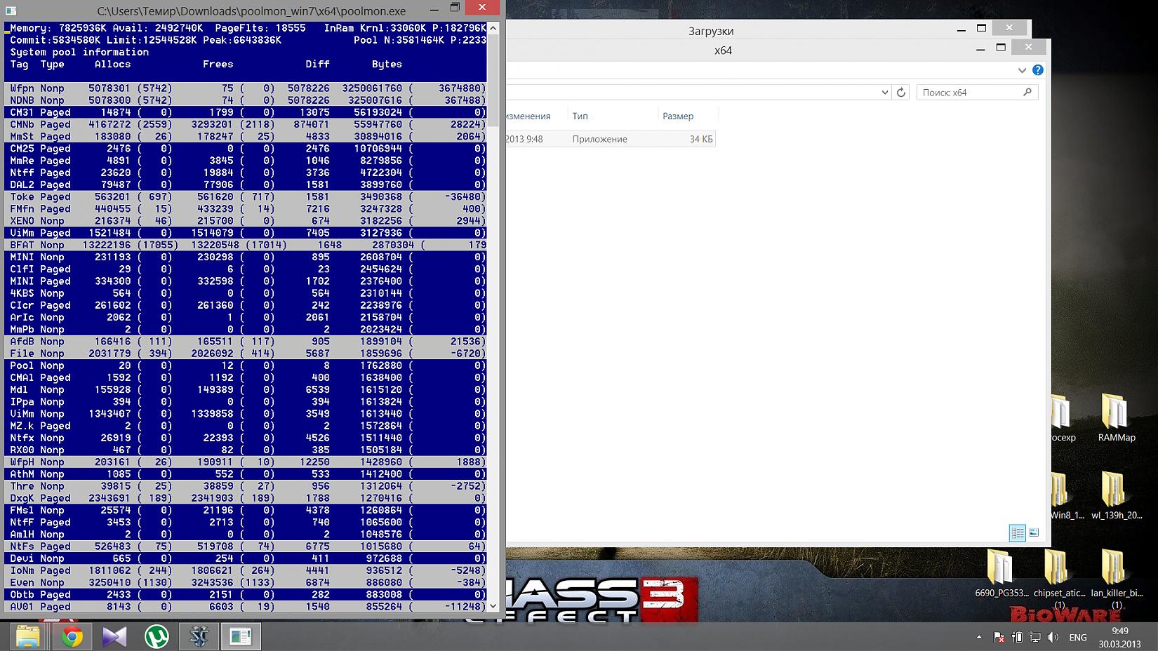 начал разбираться в проблемах с утечкой памяти, главную решил, около 4 гб сжирал драйвер IntelliMemory после установки обновления Windows 8.1, удалил драйвер. Теперь не могу понять, можно ли считать нормой до 3 гб занятой оперативки при отсутствии в занятых процессами такого количества ресурсов. При том, что никакие ресурсоемкие процессы не запущены типа браузера, торрент-клиента и т.п. Скриншоты RamMap и Poolmon: http://s019.radikal.ru/i624/1311/b3/ed4238a5162c.jpg http://s019.radikal.ru/i637/1311/b2/e966cee34f40.jpg Если смотреть в File Summary, основная часть - это от С:\Windows\system32\config\regback\software, и 2 файла от касперского, остальные менее 40 мб. http://s020.radikal.ru/i719/1311/9a/0bd7535bf991.jpg Нормально ли это ? И если нет, то в чем причина утечки. |