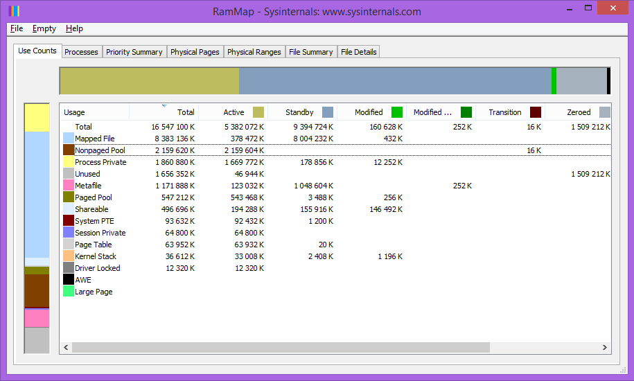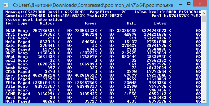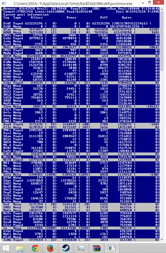 1. Запустите RAMMap и покажите скриншот вкладки Use Counts во время глюка. 2. Если утечка в Nonpaged Pool или Paged Pool - причина в каком-то из драйверов. Чтобы его определить: