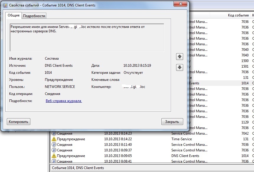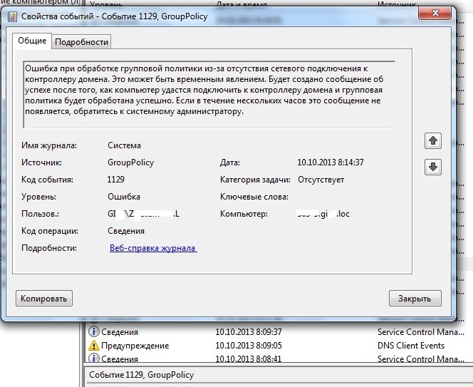 EventID - Код:131 Источник Time-Service Код:1129, источник: Group policy