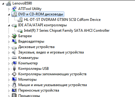 Lenovo B590 DVDRAM GT50N перестал видеть диски.Скрипит и не видит DVD-RW,вставил новый DVD+R его он увидел,начал записывать и произошла ошибка,теперь не определяет его тоже.Перезаписываемые CD видит и записывает нормально.Видел в интернете совет по удалению Channel 0 и 1 из диспетчера устройств,но у меня этих контроллеров в диспетчере нет вообще (скрин прилагаю)