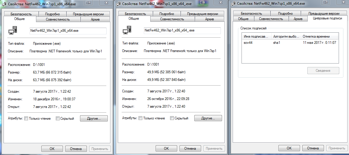 Подскажите, пожалуйста, примерные метки времени для файлов NetFw462_Win7sp1_x86_x64 следующих размеров: 52 385 061 байт 66 872 315 байт 52 867 205 байт 67 210 307 байт - январь-февраль 2017(?) 65 184 680 байт - май 2017(?) |