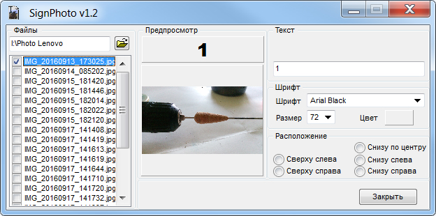 Спасибо, не совсем то, может я не так объяснил задачу. Воспользовался SignPhoto, есть в ней неудобства маленький размер окна, ограничение по размеру шрифта 78 предел, свой внести нельзя, и нельзя сдвинуть текст относительно осей х , у , а так то что нужно, выбрал слева каталог снял выделение со всех файлов и по 1му написал нужный текст, справа пред просмотр. |