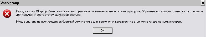 При попытки зайти на комп2 пишет, что у вас нет доступа, обратитесь к админу и т.д. (доступ у меня был, но я не чего не минял и не ставил не каких прог). И ещё чуть ниже надпись: Вход в систему не произведён: выбранный режим входа для данного пользователя на этом компьютере не предусмотрен. На обоих компах стоит WinXP prof(SP1). Повторяю это произошло не с таго не с чего. Может кто занет чего это. И да ещо постоянно пропадает общий доступ к интернет соединению, преходиться перезагружать комп (где открыт доступ). Заранее благодарен. Скрин окна ошибки прелагается. |