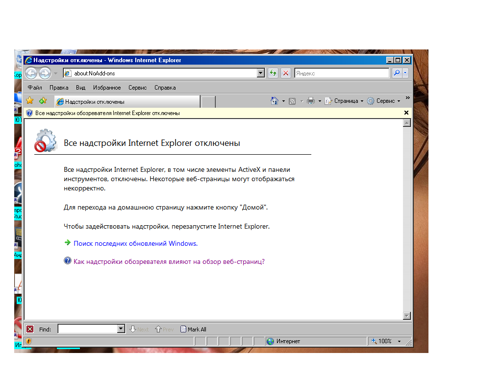 Самостоятельная диагностика Иногда к неправильной работе браузера приводят установленные надстройки или неверно сконфигурированные параметры. Чтобы проверить, заключается ли проблема в надстройках, запустите браузер без них из меню Пуск - Выполнить - iexplore -extoff. Если без надстроек проблема не возникает, запустите браузер в обычном режиме и отключайте надстройки в меню Сервис -> Управление надстройками по одной, перезапуская IE после каждого отключения. Если проблема не в надстройках, попробуйте сбросить параметры браузера. Решения из этой темы new! |