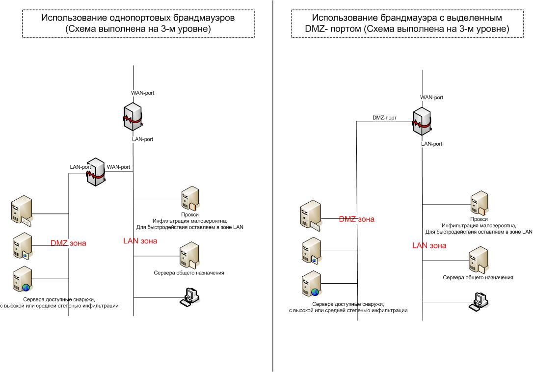 Варианты схемы: На 2х фаерволах без DMZ-порта, и фаерволом с выделенным DMZ-портом |