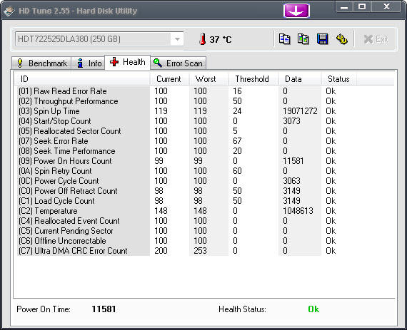 Модель - HDT722525DLA380 Серийный номер - VDB41BT4EVTMEC Емкость - 232.8 ГБ Логические диски - C: D: E: F: Среднее время доступа - 12.9 мс Средняя скорость чтения - 64 Мб/с Текущая температура - 38 °C Наивысшая температура - 38 °C Подключений к питанию - 3063 Отработано часов - ? Состояние - исправен Начало анализа - 30.11.2010 Вот таку картину выдает софтина SMART HDD 0.8.0.6638, правда кнопка диагностика не фурычит, хочет денег, а то что выше он выдал просто после установки. Если этого мало подскажите софт |