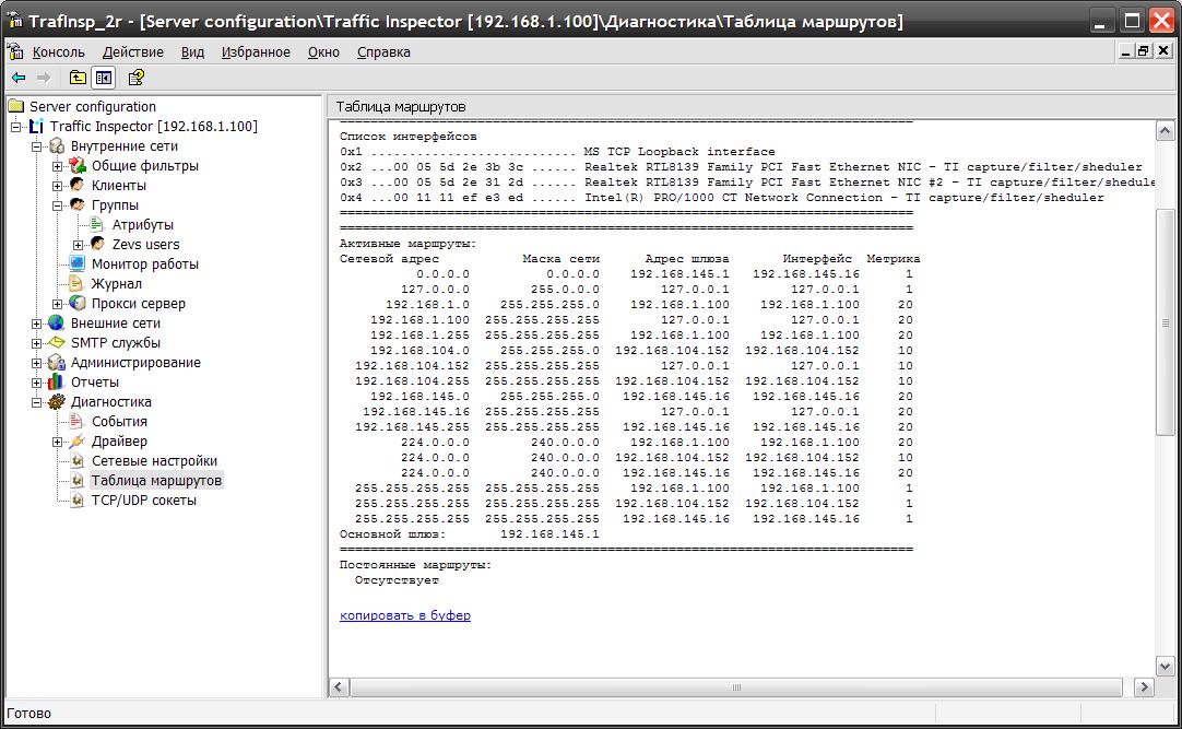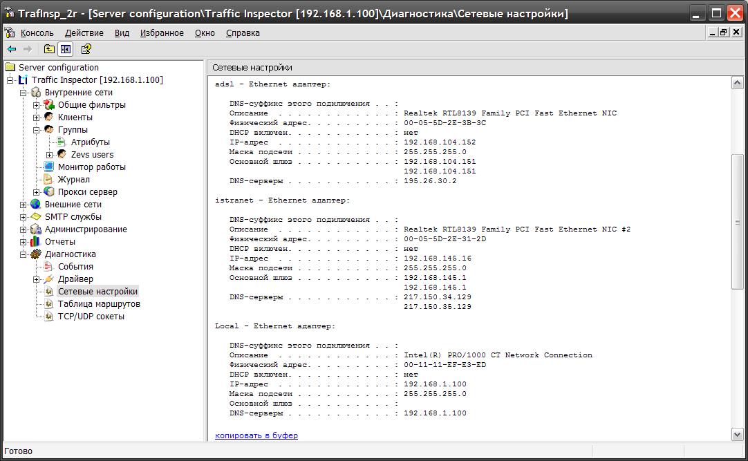 Еще раз подниму вопрос, нескольких сетевых подключений для выхода в интернет. Вкратце опишу, что есть. В компании, есть сеть из 50 машин. Один сервер, который крутится на win2003 sp1, в свою очередь он имеет три сетевых интерфейса. Два из которых смотрят в интернет. Таблица маршрутизации: внутренний интерфейс: Local - Ethernet àäàïòåð: Intel(R) PRO/1000 CT Network Connection ip - 192.168.1.100 mask - 255.255.255.0 dns - 192.168.1.100 внешний интерфейс (через него идет инет сейчас) istranet - Ethernet Realtek RTL8139 Family PCI Fast Ethernet NIC #2 IP - 192.168.145.16 mask - 255.255.255.0 шлюз - 192.168.145.1 dns - 217.150.34.129 217.150.35.129 внешний интерфейс (не рабочий, трафик не идет через него), хотя если я начинаю пинговать его на 192.168.104.152 то пинги идут в нужном направлении, т.е. через этот интерфейс. adsl - Ethernet Realtek RTL8139 Family PCI Fast Ethernet NIC IP - 192.168.104.152 mask - 255.255.255.0 шлюз - 192.168.104.151 DNS - 195.26.30.2 =========================================================================== Активные маршруты Сетевой адрес маска сети адрес шлюза интерфейс метрика 0.0.0.0 0.0.0.0 192.168.145.1 192.168.145.16 1 127.0.0.0 255.0.0.0 127.0.0.1 127.0.0.1 1 192.168.1.0 255.255.255.0 192.168.1.100 192.168.1.100 20 192.168.1.100 255.255.255.255 127.0.0.1 127.0.0.1 20 192.168.1.255 255.255.255.255 192.168.1.100 192.168.1.100 20 192.168.104.0 255.255.255.0 192.168.104.152 192.168.104.152 10 192.168.104.152 255.255.255.255 127.0.0.1 127.0.0.1 10 192.168.104.255 255.255.255.255 192.168.104.152 192.168.104.152 10 192.168.145.0 255.255.255.0 192.168.145.16 192.168.145.16 20 192.168.145.16 255.255.255.255 127.0.0.1 127.0.0.1 20 192.168.145.255 255.255.255.255 192.168.145.16 192.168.145.16 20 224.0.0.0 240.0.0.0 192.168.1.100 192.168.1.100 20 224.0.0.0 240.0.0.0 192.168.104.152 192.168.104.152 10 224.0.0.0 240.0.0.0 192.168.145.16 192.168.145.16 20 255.255.255.255 255.255.255.255 192.168.1.100 192.168.1.100 1 255.255.255.255 255.255.255.255 192.168.104.152 192.168.104.152 1 255.255.255.255 255.255.255.255 192.168.145.16 192.168.145.16 1 Основной шлюз 192.168.145.1 альтернативный шлюз 192.168.101.151 (не отрабатывает, когда основной интерфейс падает.) 1. Вообщем необходимо, чтобы когда падает сеть на основном интерфейсе winda направляла интернет трафик на второй интерфейс. 2. Или можно сделать, так чтобы запросы с определенных ip адресов из внутренний сети шли по второму интернет соединению. На обоих соединения настроен NAT. При этом на моей тачке где стоит linux я проверял два соединения работают на ура, даже без каких либо настроек. Трафик идет по тому интерфейсу, который я делаю основным. А windows при физическом отключении провода упорно не хочет работать. Помогите, пожалуйста в разрешении этого вопроса. Спасибо! Прилагаю срин шоты таблиц маршрутов и интерфейсов. |