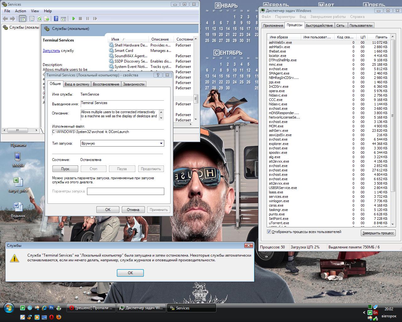 Совместимость быстрого переключения пользователей (Fast User Switching Compatibility) - работает, а Службы терминалов (Terminal Services) как показано на скрине не запускается. помогите плиз |