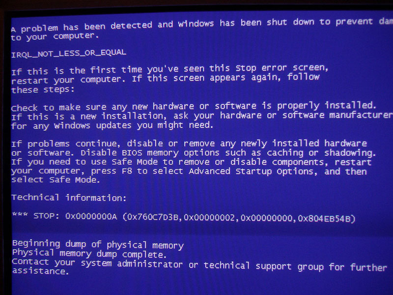 ***STOP: 0x0000000A (0x760C7D3B, 0x00000002, 0x00000000, 0x804EB54B)