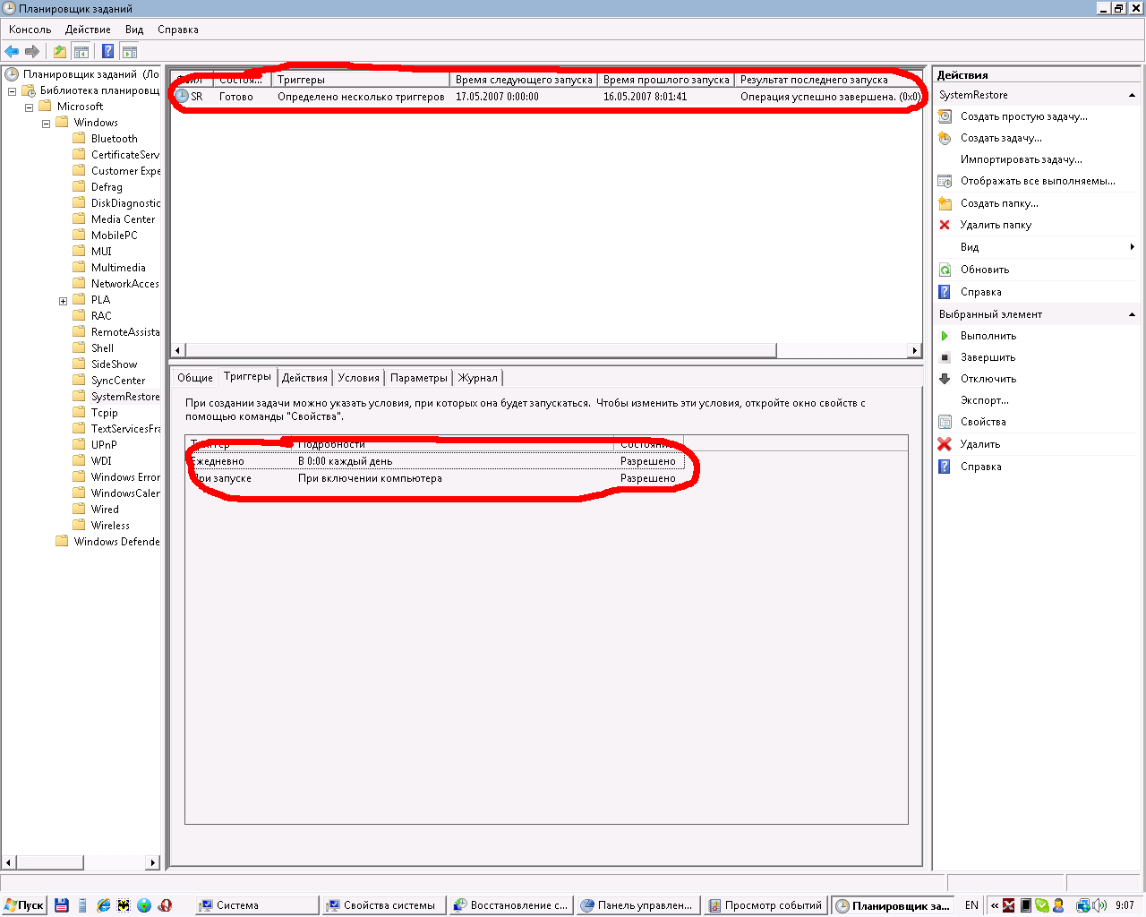 Есть ли в журнале событий ошибки System Restore? Сколько свободного места на разделе? Если используются две и более ОС, производилась ли загрузка в другую ОС - XP? |