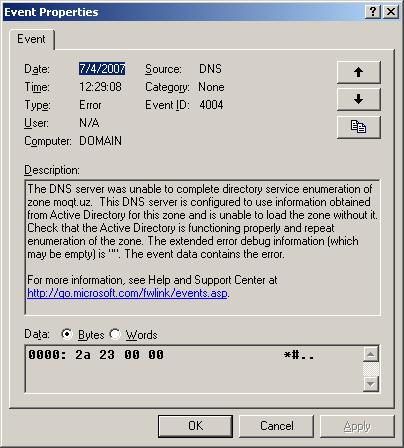 2-ошибки явно указывают на проблемы с ДНС. Комментарии можно прочесть здесь http://eventid.net/display.asp?event...ce=DNS&phase=1 3-проверьте сервер с помощью утилит dcdiag, netdiag, nslookup... |