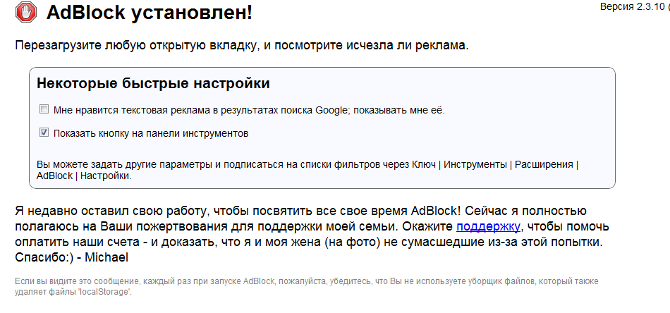 Здравствуйте! Помогите, пожалуйста, разобраться в таком вопросе: Имеется Apple Safari 5.0.5 Portable. Установил AdBlock 2.4.1 и теперь при каждом запуске браузера открывается вкладка (см. скрин). Посоветуйте, кто знает, как от этого избавиться? Никаких "уборщиков файлов", удаляющих файлы 'localStorage', не используется. ОС-Windows 7 SP1 x64. Заранее спасибо всем, кто откликнется.