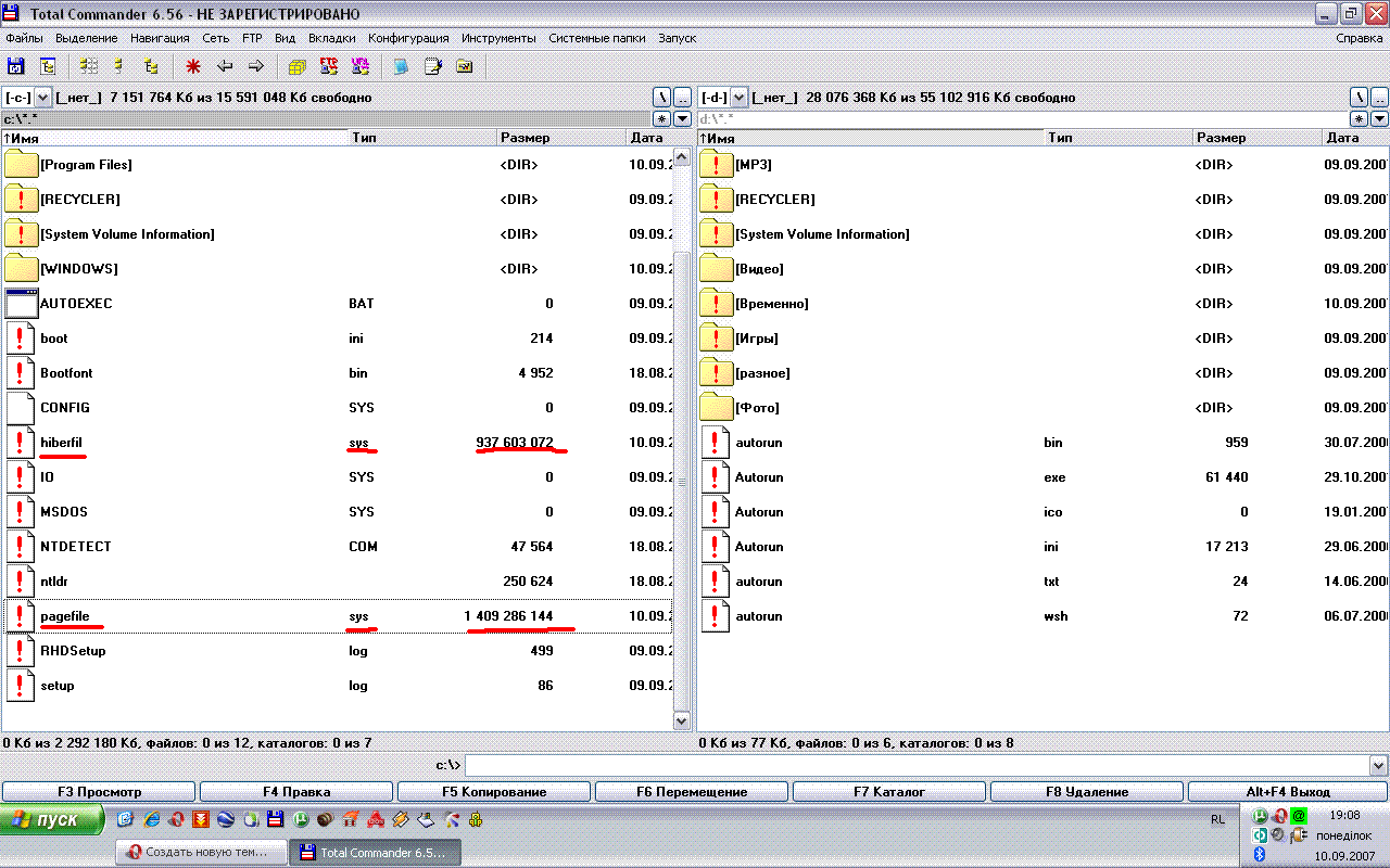 Всем привет. Вот в чем суть моей проблемы, мы имеем Windows XP HOME лицензионный который был с ноутбуком. после установки виндовс (все прошло удачно) винда занимала 4 гига (она с SP2) после установки программ 6 гиг (стоит на отдельном диске С: так что все на лицо) после чего она рештла обновится и обновилась на 250 мег с сервера и увеличилась на 2 гига (шок) я начал искать фаилы которые лишние и вдруг увидел что фаил который невидно через ВИНДОВС (увидел через командер) весит 1,5 гиг pagefile.sys и hiberfile.sys стал 937 метров. ЧТо ЭТО может быть??? анивирусы молчат??? соотвественно файлы не удаляются так как они системные...