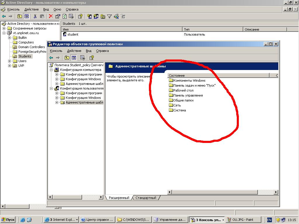 Профиль | Отправить PM | Цитировать Политика домена для Конфигурации компьютера применяеться (Политика паролей, доступ к компьютеру из сети, Добавение рабочих станций в домен), Конфигурация Пользователя тоже все отлично. Но когда грузиться профиль Student (у него свой OU - students создан и как раз таки для него настраиваеться политика безопасности, которая и не применяеться на клиентских тачках).