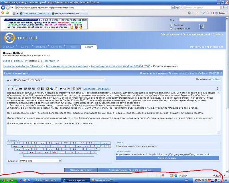 Народ вобщем ситуация такая, я создаю дистрибутив Windows XP Professional полностью русский для себя, вобщем всё как у людей, натянул SP2, потом добавил все вышедшие обновления после SP2, архив с обновлениями брал отсюда, тут человек выкладывал за что ему большое спасибо, потом добавил Windows Internet Explorer 7 чтобы был по умолчанию, добавил Windows Media Player 10 русский, чтбы тоже был, всё протестил на виртуальной машине, работает как надо, но возник один вопрос: "Как сделать чтобы по умолчанию ставилось оформление от Media Center Edition 2005?", то есть оформления меню пуск, оно приветствия и прочее, без звуков и без скринсейверов, только элементы визуального оформления. Почитал тут инфу, много и полезная инфа, сделать можно двумя способами: